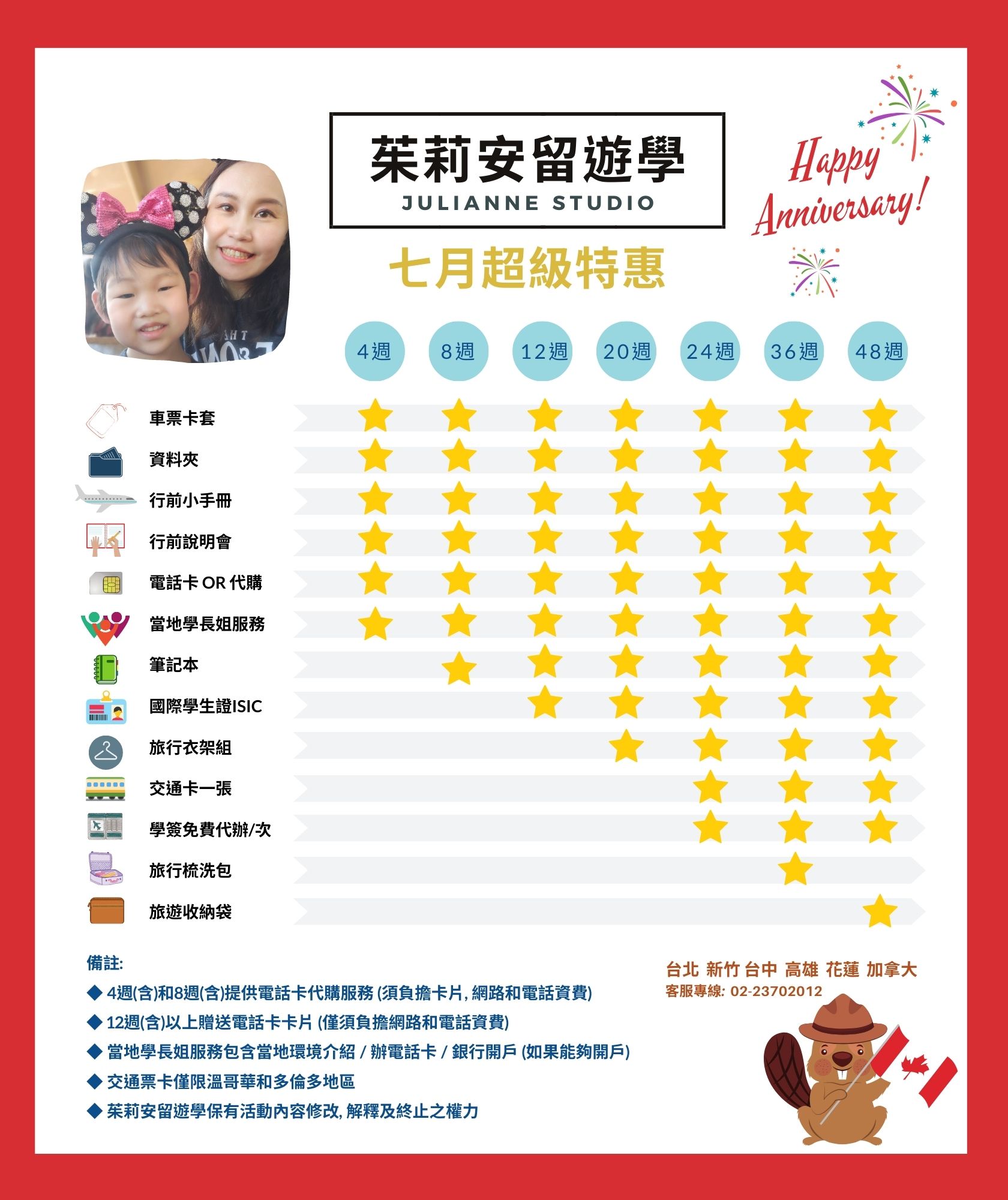 還記得3年前茱莉安抵達多倫多定居,不少人期待我們會馬上在這裡開設公司,然而茱莉安生深知開設當地公司的目的「招生」應遠大於「服務」,為了對履行對台灣學員和家長們承諾,所以我們一直以駐點的方式,以關心並協助我們的愛生為首。當然,茱莉安也對一樣來自台灣來的其他學生或打工客,在時間允許的情況下盡量提供諮詢上的協助,包含簽證、住宿、生活疑難雜症等,口碑一點一滴的建立,但還是有不足之處需要改進。