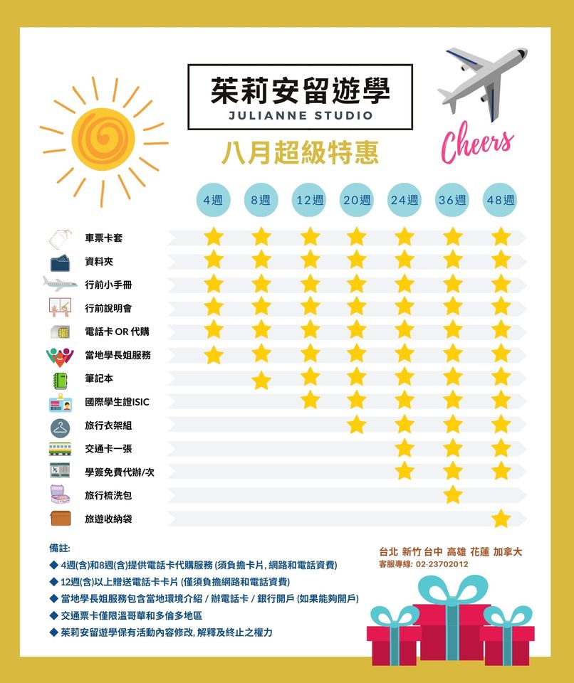 先報名先付學費 就能享有很棒的匯率喔! 還有眾多好禮可以拿, 加上免費的當地學長姐貼心服務